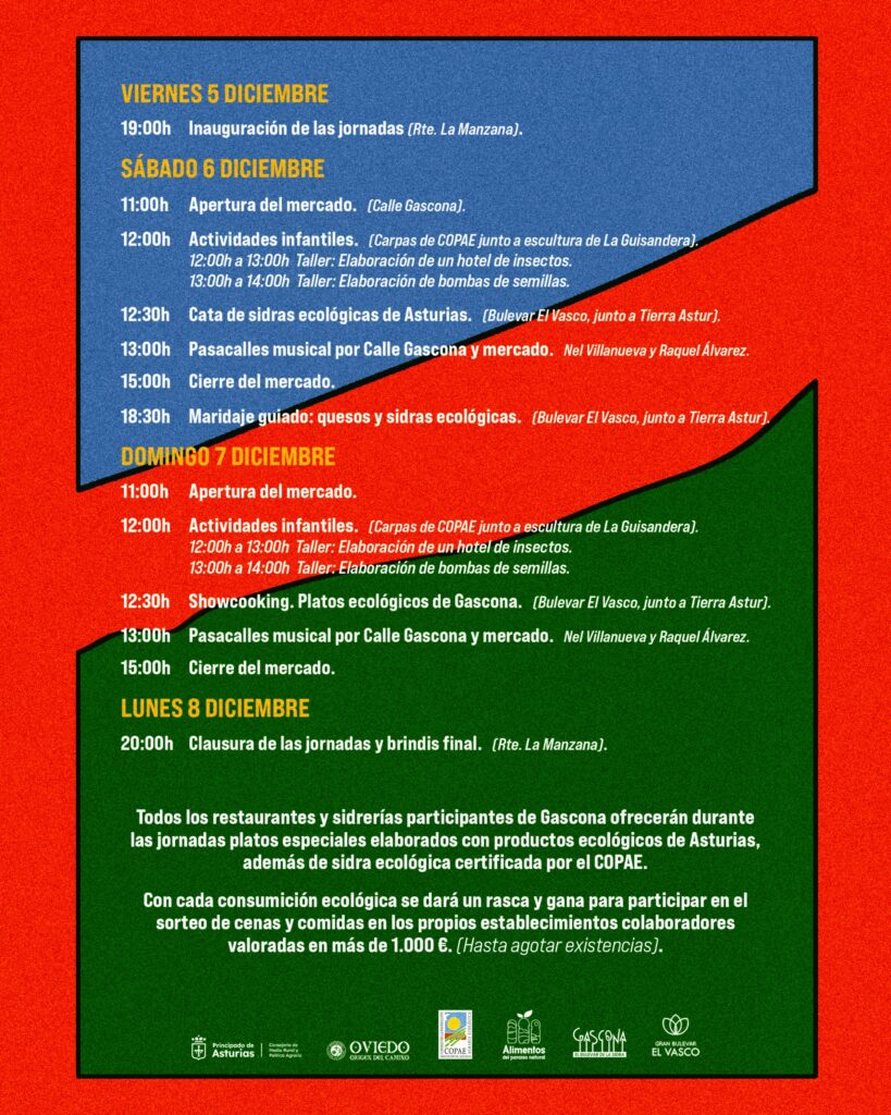Las jornadas se inaugurarán el viernes 5 de diciembre a las 19:00 horas en el restaurante La Manzana. El programa continuará el sábado y domingo por la mañana con la apertura del mercado y el inicio de las actividades infantiles. El sábado por la tarde tendrá lugar un maridaje guiado de quesos y sidras ecológicas, mientras que el domingo será el turno del showcooking de platos ecológicos de Gascona. La clausura y el sorteo de cenas se celebrarán el lunes 8 de diciembre a las 19:00 horas, nuevamente en el restaurante La Manzana.