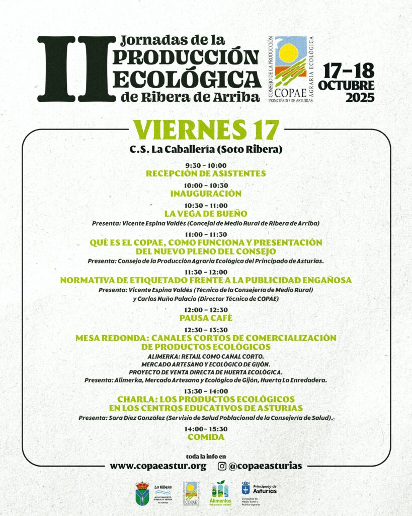 Las jornadas comenzarán el viernes 17, con una serie de ponencias técnicas orientadas al sector ecológico asturiano. La temática principal será la comercialización de productos ecológicos, con charlas sobre etiquetado y publicidad engañosa, canales cortos de comercialización y alimentos ecológicos en centros escolares. Las jornadas técnicas tendrán una amplia variedad de participantes: técnicos del Principado de Asturias, personal de Alimerka, productores en activo, miembros del pleno del COPAE y representación de otras asociaciones.