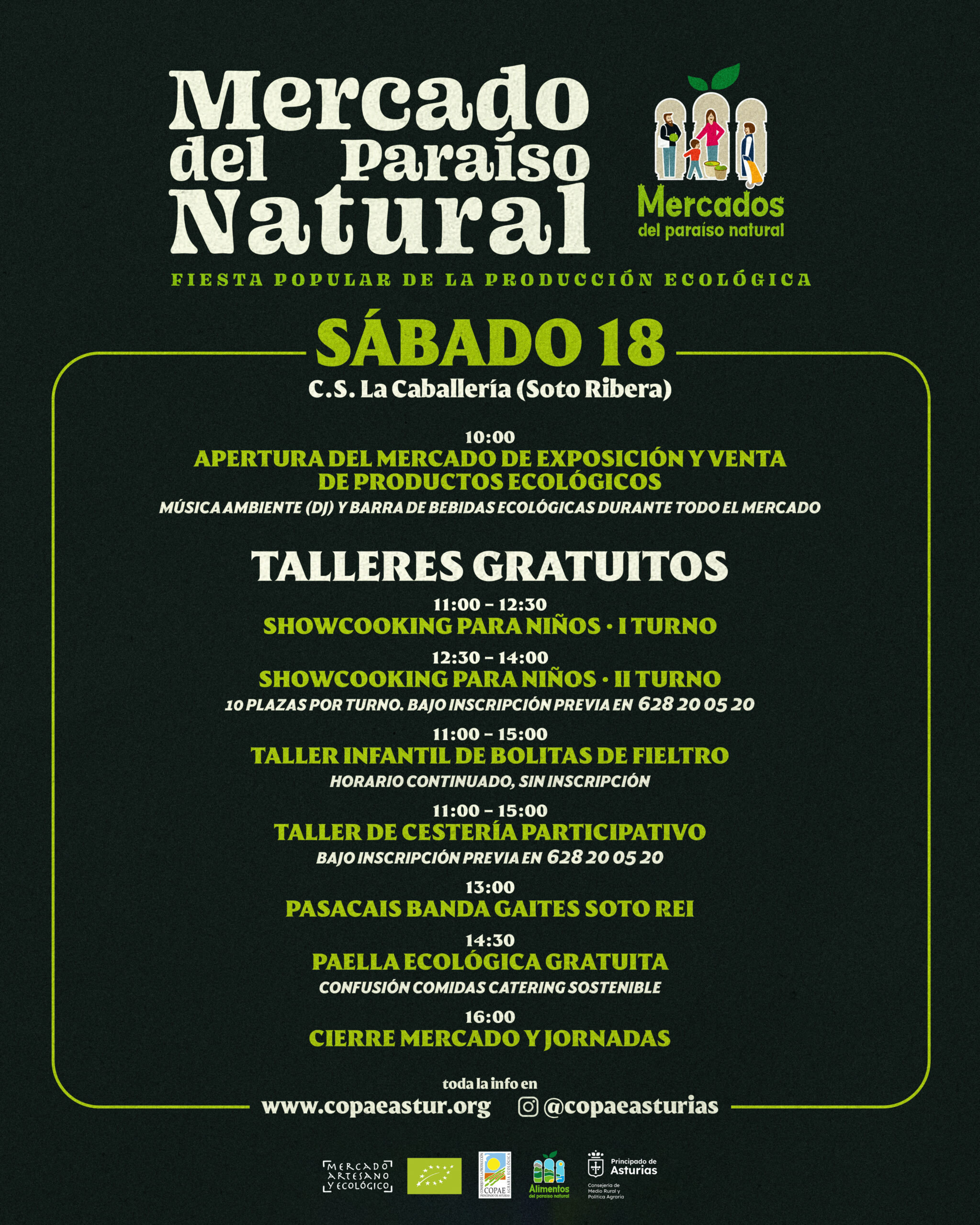 El día estará marcado por una serie de talleres para niños y adultos. Estos talleres son un showcooking/taller de cocina infantil, un taller de elaboración de bolas de fieltro, también para los más pequeños, y un taller de cestería para adultos. Para participar en estas actividades se debe realizar inscripción previa llamando al teléfono 628 20 05 20.